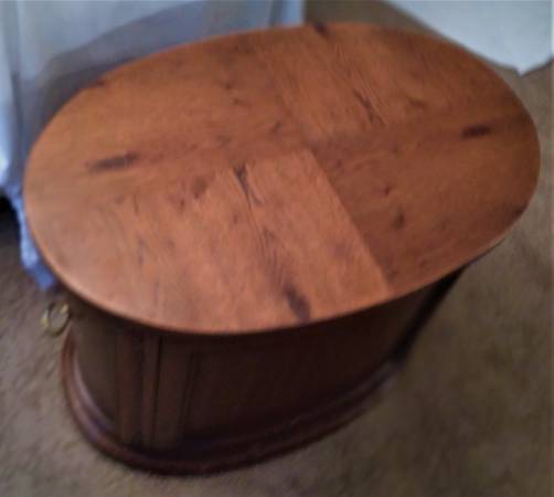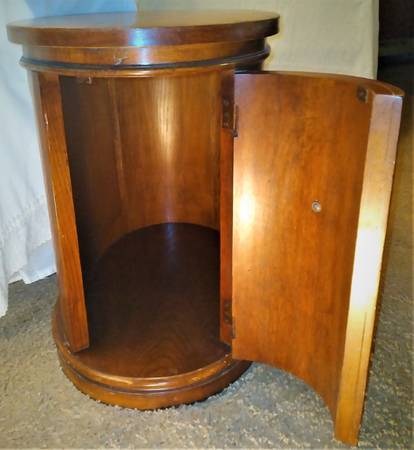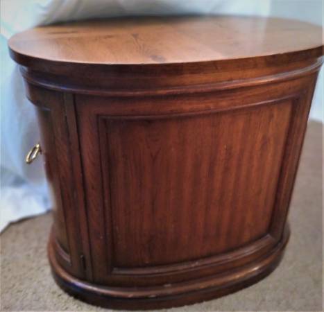 DRUM OVAL SIDE TABLE WITH DOOR TO STORAGE.