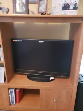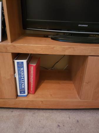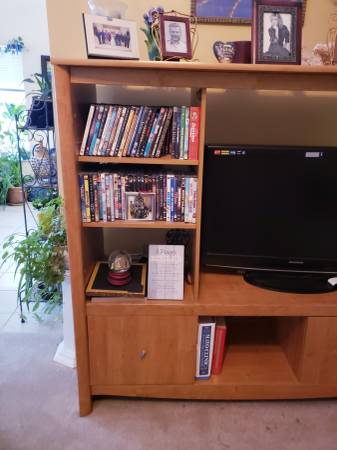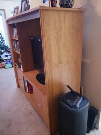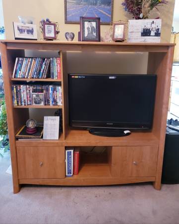 TV Entertainment Center w/Shelves and cabinets in good condition. Measures 59" L x21" D x 57.5" H. Space in the under middle part Measures 18.75 x 14". I have a 37" tv in tv part. Measures 38 x 36.