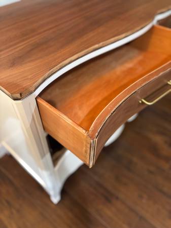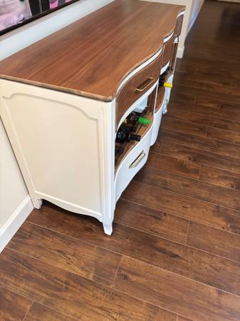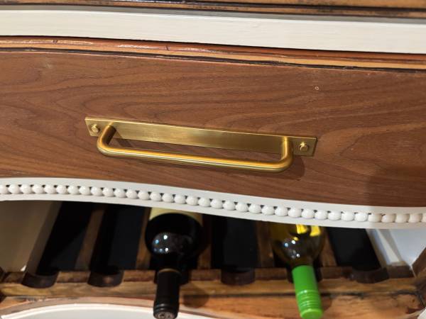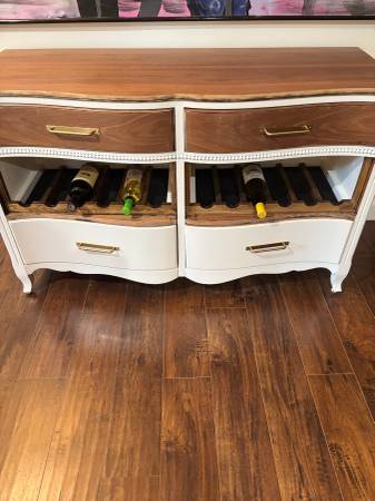 Elegant modern, meets rustic, wine/coffee bar-buffet/ credenza/sideboard. Painted in satin cream. Drawers and top were sanded and polyd for durability. New hardware added. An awesome piece that will be a conversation to be had! So much prettier in person! Meas: 52-W, 19-D, 32 1/2-H. Solid, heavy, quality.