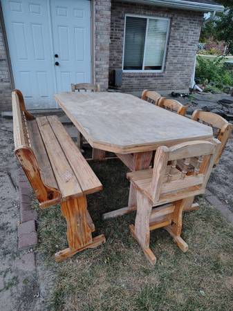 Approximately bar height table w/ bench & 5 chairs. Recently completely sanded down, looks great as it (would just need a polyurethane top coat) or could be stained and top coated. Solid wood,...