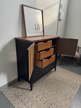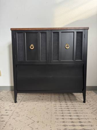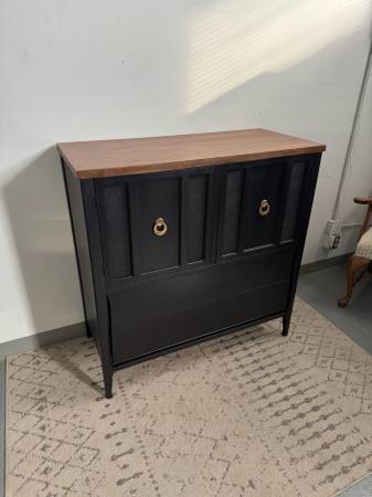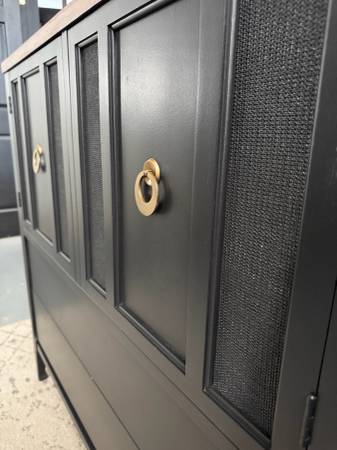 This sleek black cabinet blends modern design with timeless character. It features a rich walnut-stained wood top, clean lines, and elegant gold ring pulls for a touch of sophistication. The piece has been refinished in a durable satin black finish with multiple coats of polyurethane for lasting protection. Perfect as an entryway cabinet, bar, or accent storage piece to elevate any room.