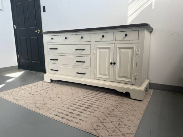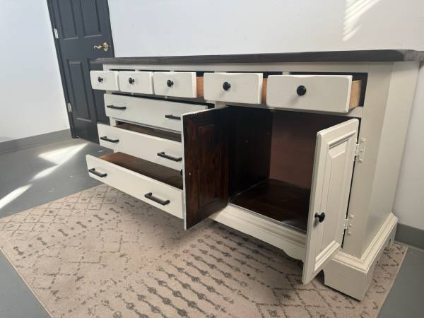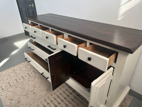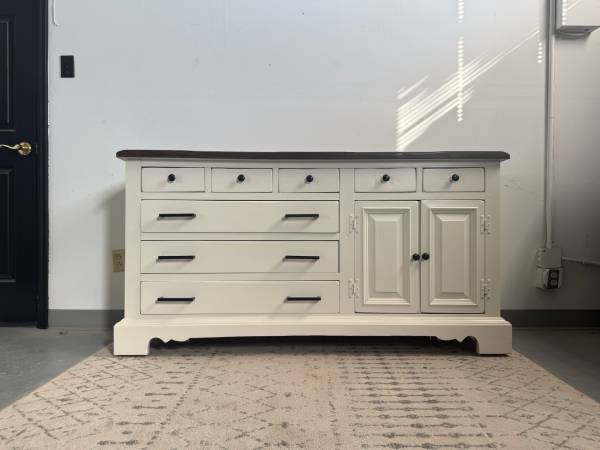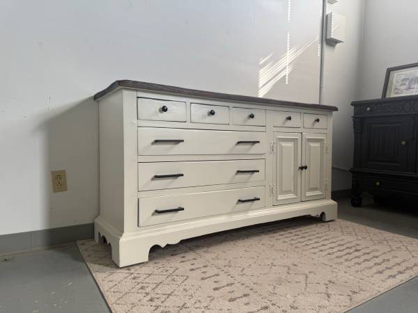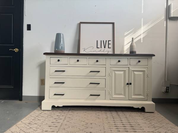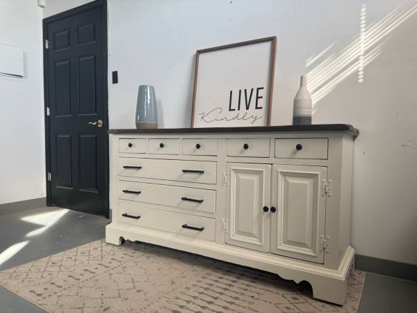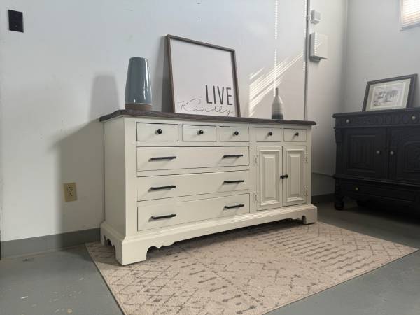This stunning dresser has been freshly refinished in a crisp white with bold black hardware for a clean, modern contrast. The dark-stained wood top adds warmth and character, making it a perfect statement piece for any home.