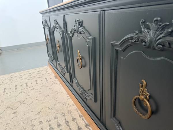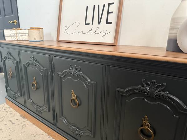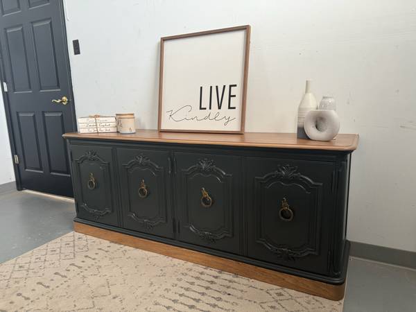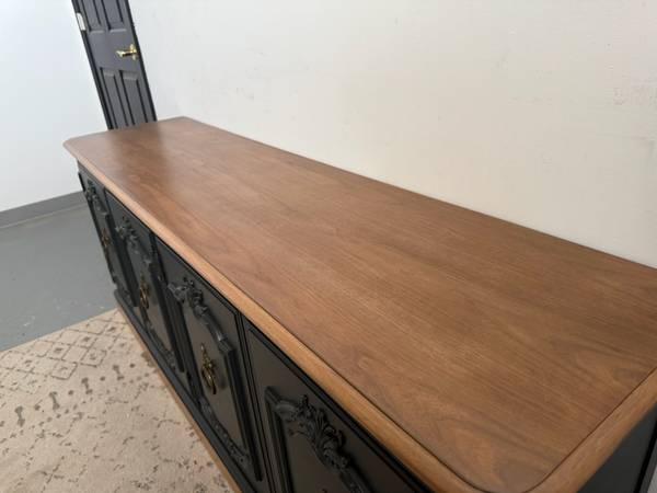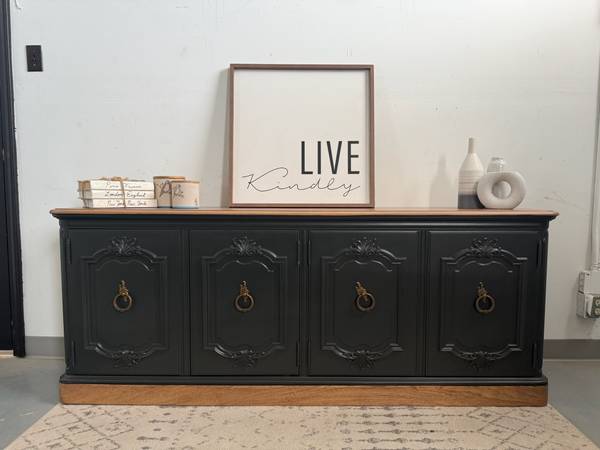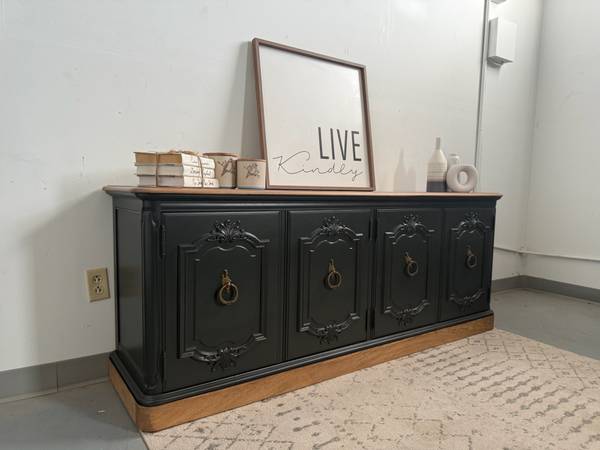 This beautiful piece has been refinished in a deep, elegant black with a rich wood top and base for the perfect contrast. The ornate details on the doors are highlighted with classic antique brass ring pulls, adding timeless charm and character.
