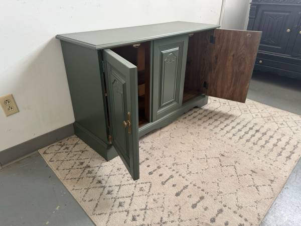 This beautiful buffet has been refinished in a timeless sage green and sealed with multiple coats of polyurethane for lasting durability and protection. The champagne gold hardware adds just the right touch of elegance, making it a versatile piece that works in any space.