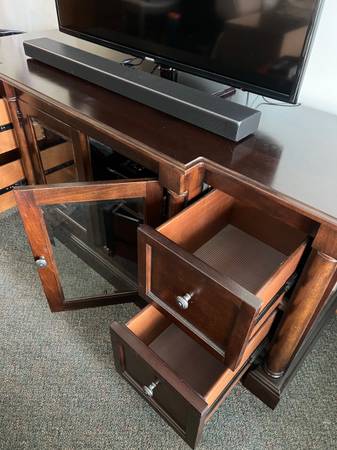 Really nice quality. It can have glass doors for TV / Stereo components (as shown in pictures) or I also have the inserts to make the doors solid to cover storage.