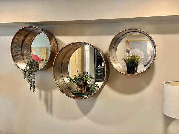 This is such a cool set of three mirrors deeply recessed allowing you to place items inside their frames! Talk about a conversation piece! Place them as you want and create an unexpected focal point...