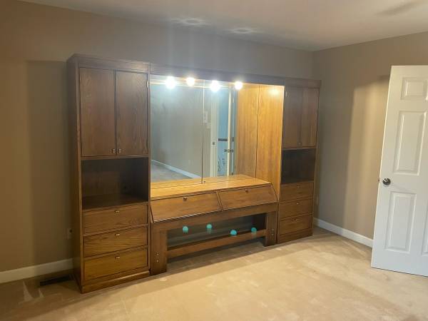 All drawers slide perfectly, all cabinet doors close flush, lights work, no pet damage, non-smoking home. The oak has that beautiful warm honey tone and the grain is stunning. This set originally cost well over $5,000 new.