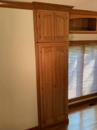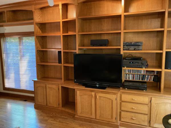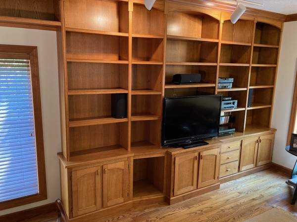 Wall unit for sale. Constructed by owner using oak plywood and solid wood, stained in medium brown. Main unit is 3 base cabinets and 5 upper shelf cabinets (combination of fixed and adjustable shelves), plus a bridge cabinet and tall cabinet (2 pieces). Overall length is approx 21' 3", main unit is approx 12" 8". All approx 9'1" tall. Base cabinets are 17" deep, center base is 26 1/2" deep. Drawer units have metal slides, all base units have adjustable levelers, and all pulls are custom brass and oak hardwood.