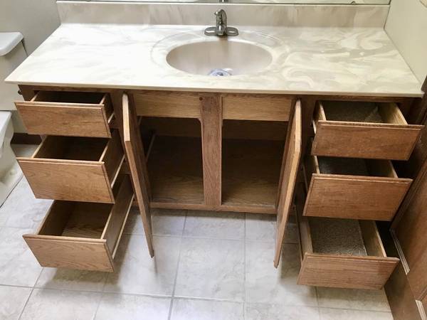Standard size: W 59“ H 32” D 22” Backsplash 4” Very heavy top with cutoff for plumbing. I n very good condition. Pick up in Edwardsville, IL.