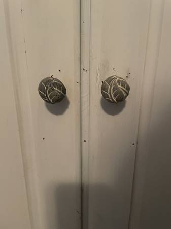 White distressed finish. Three upper shelves visible through glass doors, 1 drawer, and 2 shelves behind wood doors below. 76" H x 38" W x 18" D. In great condition. Downsizing and sadly have no...
