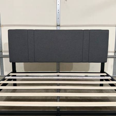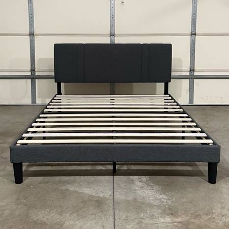 New platform queen bed in a dark gray upholstery. Never been used and in perfect condition. No box spring needed for this bed. Can hold up to 1200 los. Dimensions are 61"W x 82"L x 38"H or 42"H (headboard height is adjustable). Platform height is 12" off the floor. Also have a, new in the box, 12" queen hybrid mattress for sale as well, let me know if you're interested. Can deliver for extra if needed or can help load at easy home garage pick up in O' Fallon, Illinois. Cash only.