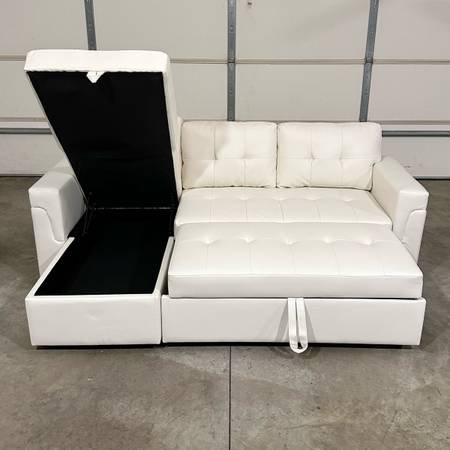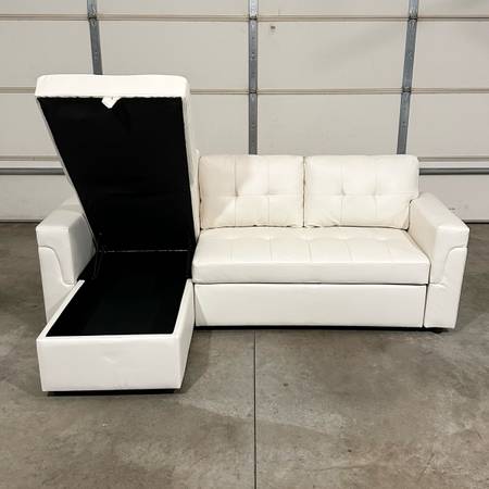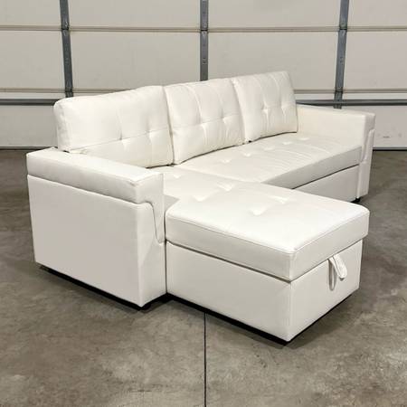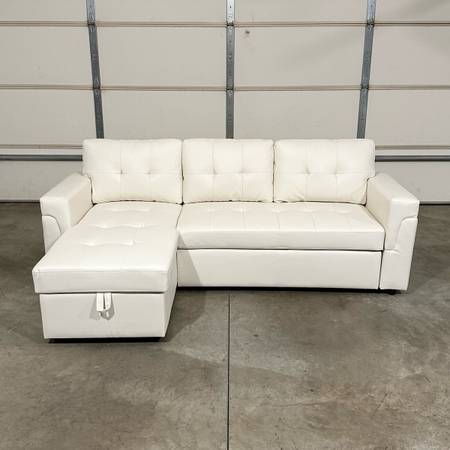 New, never been used, in perfect condition, L- shape sofa in a faux white leather. Has a chaise that can be placed on the right or left side with storage inside and a large attached pull out to turn it into a sleeper. Overall dimensions are 84”W x 54”D x 34”H. Willing to deliver for a little extra if needed or can help load at easy home garage pick up in O’Fallon, Illinois. Cash only.
