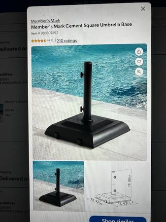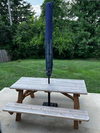Cedar picnic table 6 ft.. Comes with Sam's Club 10 ft Sunbrella and base. Set up but never used. All items are new and as pictured