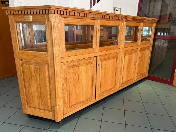 Beautiful handmade wooden display cases, with back lighting under-mounts.They are 18 3/4" wide,105" long(from back corner to back corner),53" high. 2 full, separate units, each $3,000. Units have a...