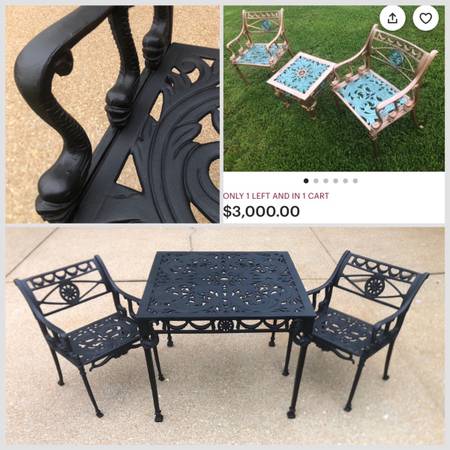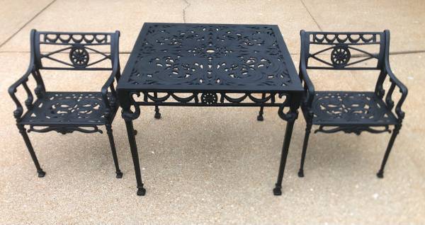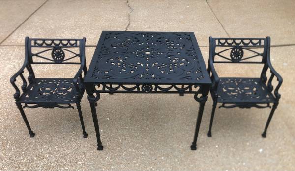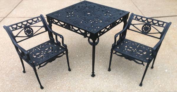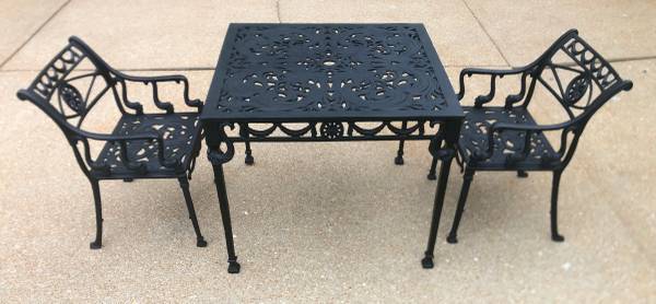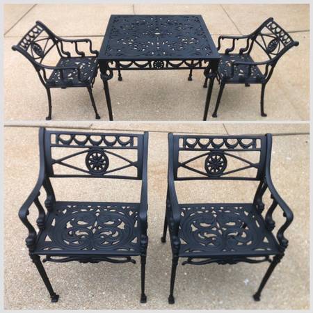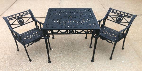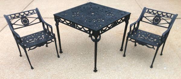 Set is in excellent condition, the chairs are bistro size chairs just an fyi, check out the dimensions for actual size. This table i a nice size and it’s heavy weighing 50 pounds.