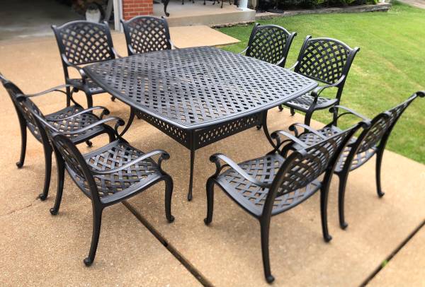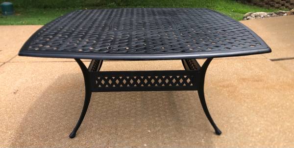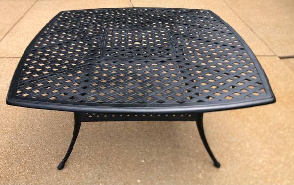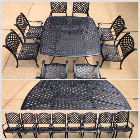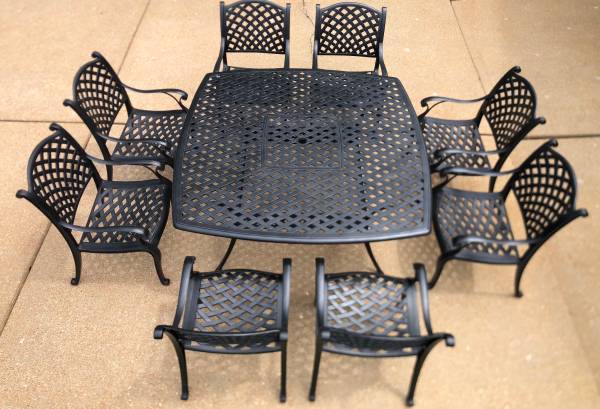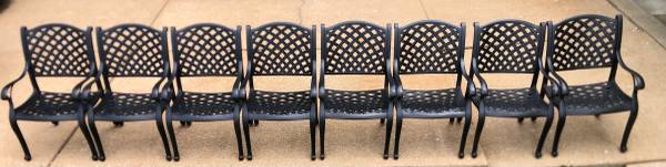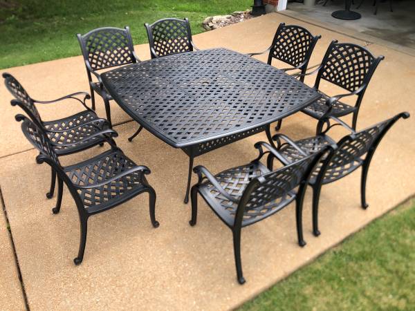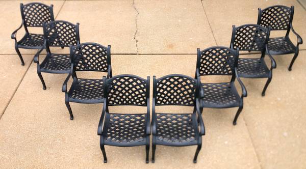 Set includes a Heavy 64 inch 80 pound square table and 8 chairs Stationary Arm Chairs.