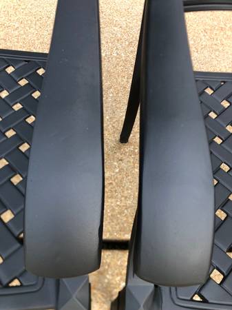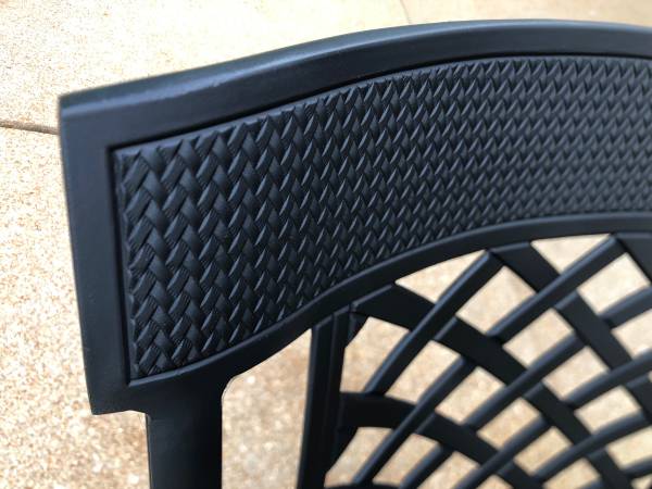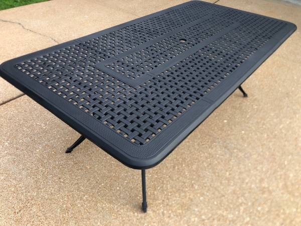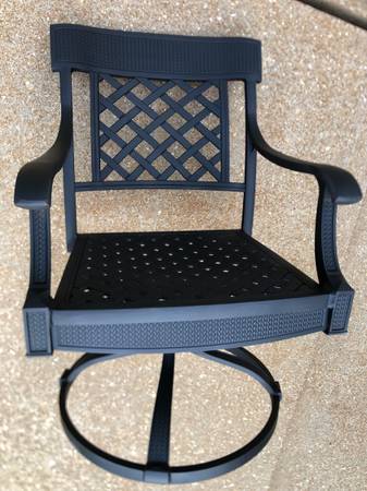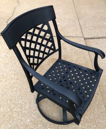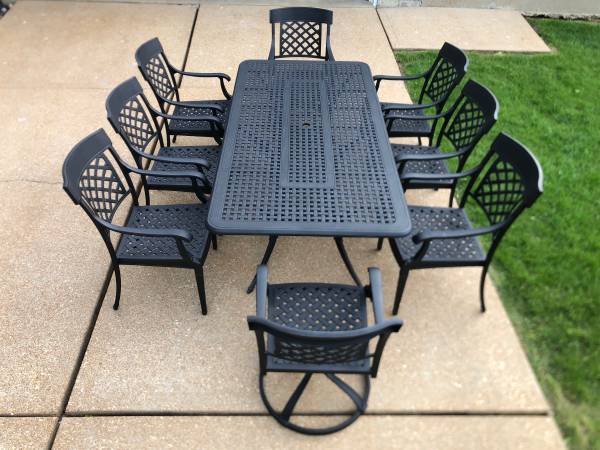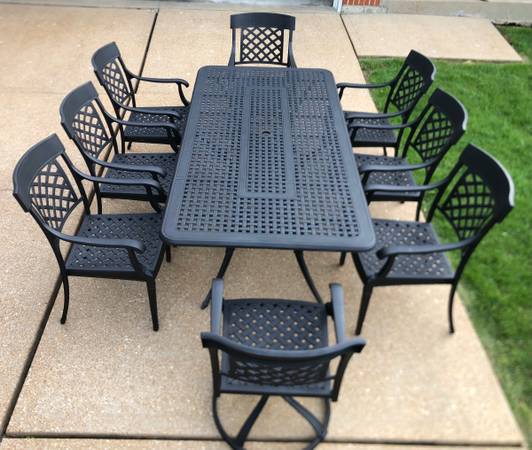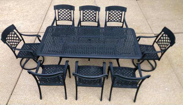Set includes 8 chairs, 2 Swivel Rocker chairs and 6 Stationary Dining Chairs, and a Heavy Solid Huge 7 Foot 105 pound Rectangular Table. All High end Quality Cast Aluminum Outdoor Furniture color black