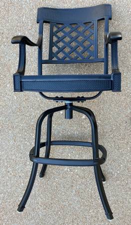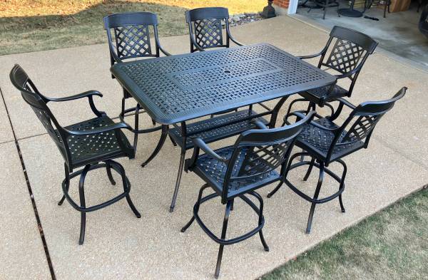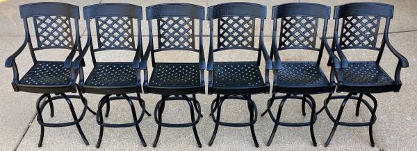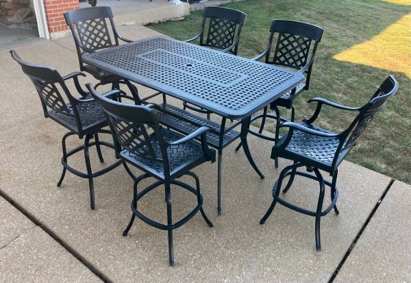 This 6 seat set is in excellent condition. New at Retail Chairs are $1200 each and the table is $2200, at retail you will pay around $10,000.00 for this Bar Height Dining set.
