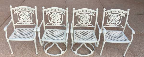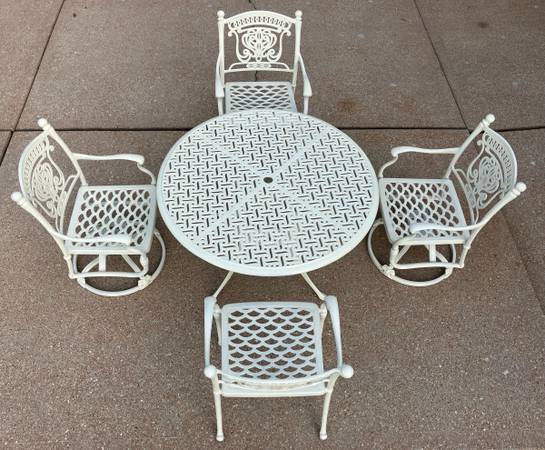 Beautiful Outdoor Patio Furniture High End Hanamint Brand Outdoor Dining set with 4 chairs- 2 Swivel Rocket chairs and 2 Arm Chairs and a round 48 inch table. This table is beautiful and roomy.