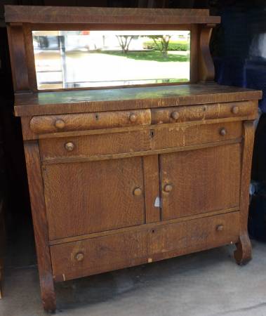 Antique sideboard, buffet cabinet with mirror and wood wheels