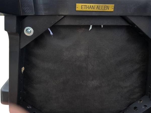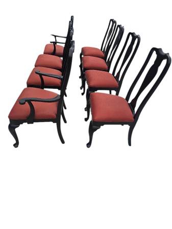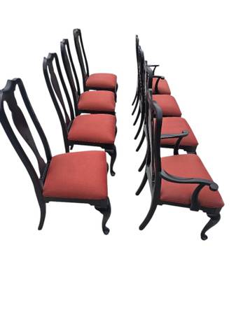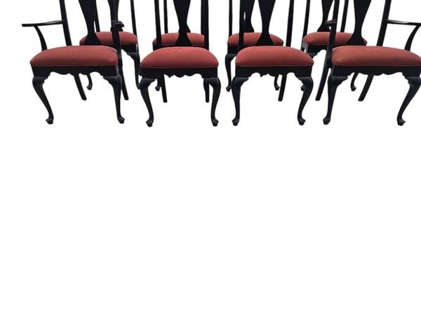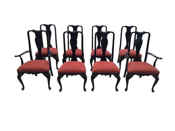 A striking set of 8 Ethan Allen dining chairs in the elegant Queen Anne style. The set includes two armchairs and six side chairs, offering a full dining arrangement.