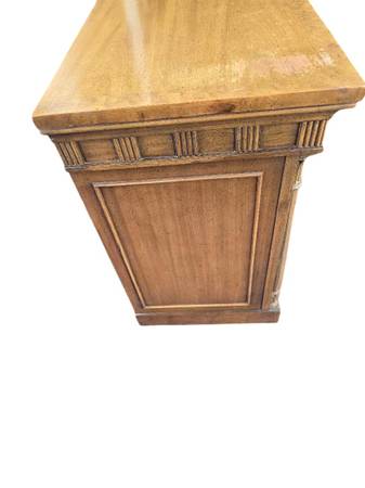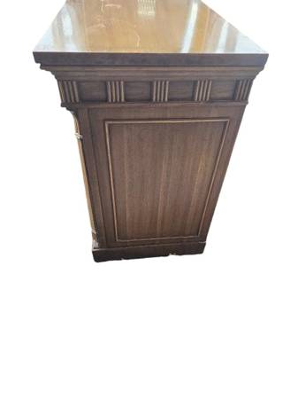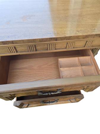 This vintage Thomasville triple dresser is a great addition to any retro-style home. With 9 drawers, it offers ample storage space while its 33-inch height, 20-inch length, and 82-inch width make it a perfect fit for any bedroom. The dresser's brand, Thomasville, is known for its quality furniture, and this piece is no exception. Its classic design and durable construction make it a reliable choice for anyone looking for a stylish and functional dresser.