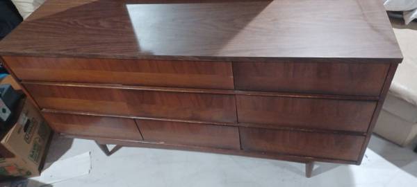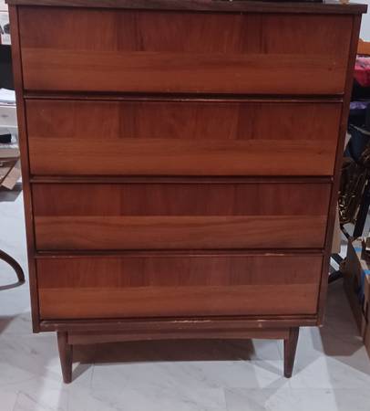 This Mid-Century Modern Bedroom Suite includes 4 pieces: 2 nightstands, chest of drawers and a dresser with attached original mirror, all crafted from medium wood with dovetail drawers. The set is designed for adults and requires no assembly, sans putting the mirror back on the dresser once you get it home. The style is described as Mid-Century Modern, built in March and April of 1969, adding a retro touch to the bedroom. This bedroom suite is a perfect addition to any home looking to incorporate a timeless and stylish design into their space.