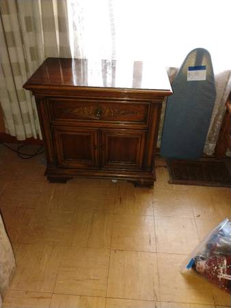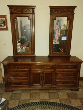 Nice older dresser, large cabinet and a smaller cabinet. They are all the same color even though the pictures look different. bedroom set