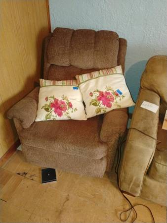Very good shape rocker/recliner. We just need it gone. There is nothing wrong with it. Comes with pillows if you want them.