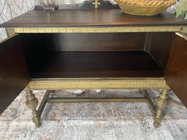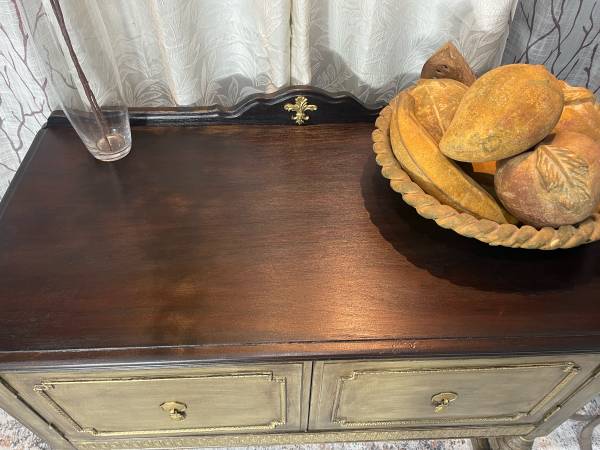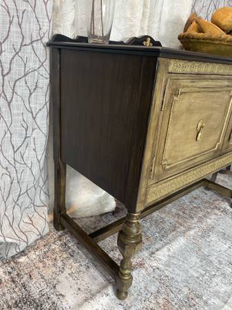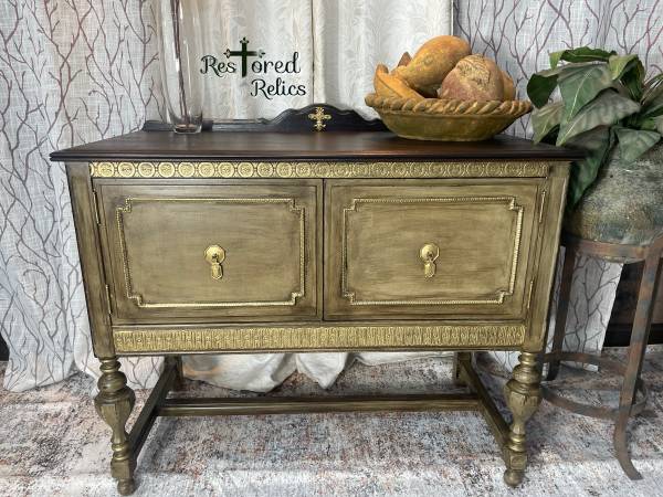 Beautiful Vintage Rustic Farmhouse Buffet. This gorgeous girl has been hand stained in a custom palettes of dark browns & tans using a special layering technique to achieve a soft weathered look. Beautiful gold accents bring out the beauty of this buffet! She’s constructed of solid hardwood, the original brass gold hardware. Perfect for an entry way, foyer, kitchen, living room, bathroom. The measurements W 40-D 20-H 32 I accept Venmo, PayPal, cash