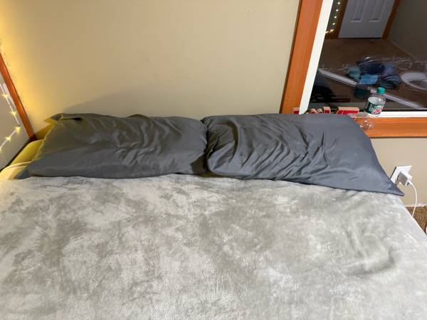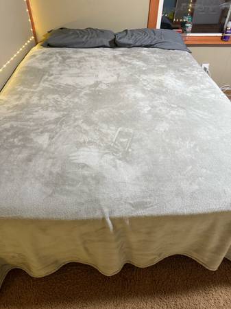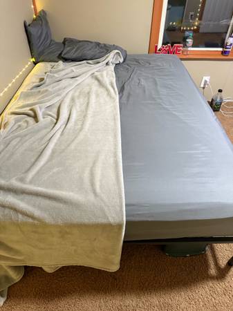 Brand new we upgraded the bed for my son and he doesn’t like the new change the mattress is still so clean same with the bed sheets and pillows and blankets it comes with everything the bed frame is so easy to put together no bolts no nuts no nothing just snaps to together it does come apart so it easy to move must come grab with truck or trailer No CAR any questions pls let me know