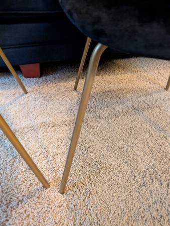 Pair of 2 black velvet modern dining chairs with gold metal legs. Has leveling feet (screw type) on bottom of legs. Willing to sell individually.
