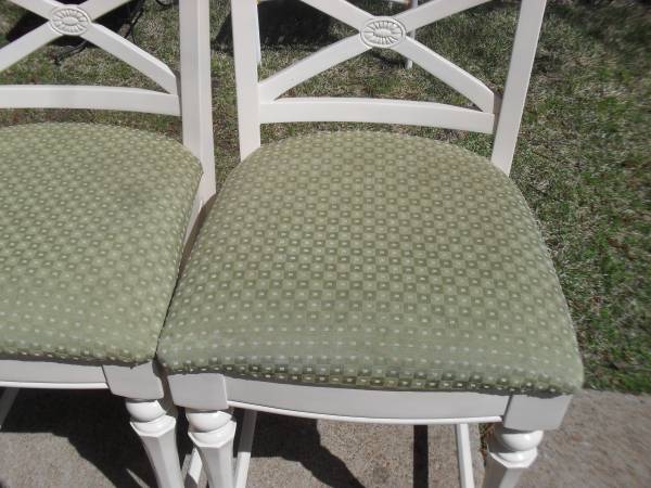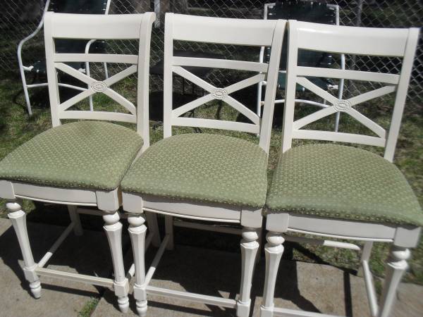 Three breakfast bar stools, cream color with light green pattern seat, the seat is 19" x 19", floor to seat is 26", overall height is 41", $150.00 (cash only)