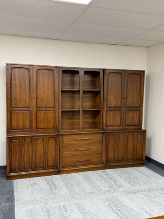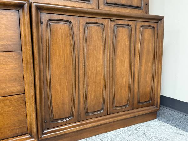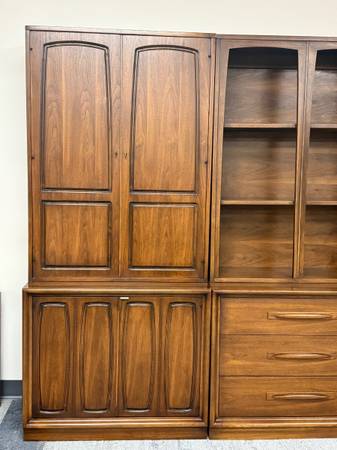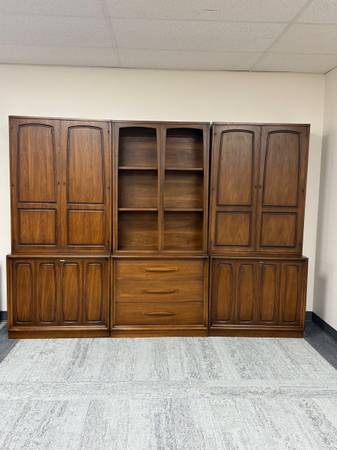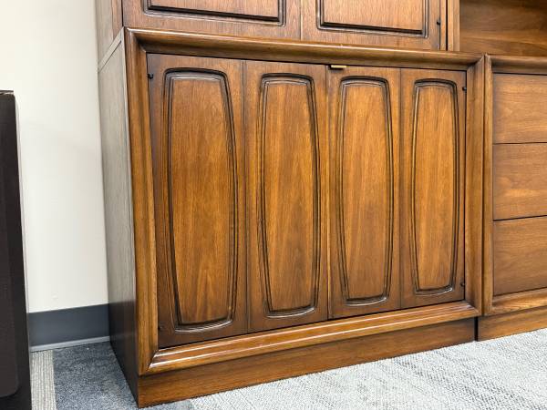 -WEAR: CONSISTENT OF AGE / SUPER NICE! - NO CHIPS, SPLITS, SCRATCHES OR CRACKS - LOOK AT PICS CAREFULLY- LEFT 2-DOOR BOOKCASE DOORS STICK A LITTLE (ST LOUIS HUMIDITY) - RICH WALNUT FINISH -