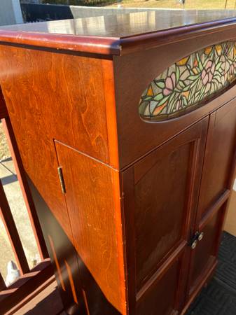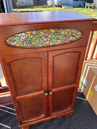 Lighted CD, DVD, VHS storage cabinet. Storage in both doors and rear shelving. Adjustable shelving. Not perfect but very nice condition. Minor scraped from moving around. See.photos.