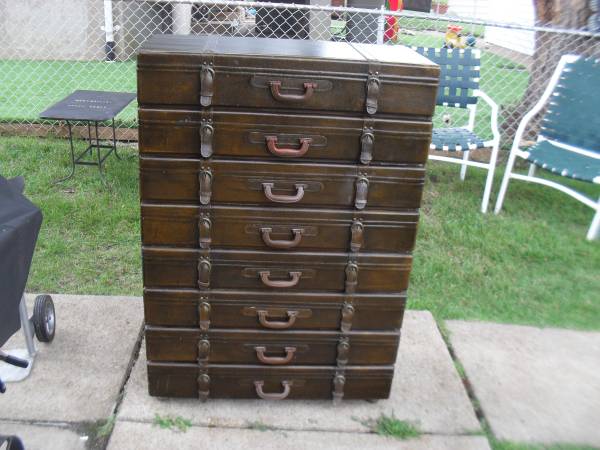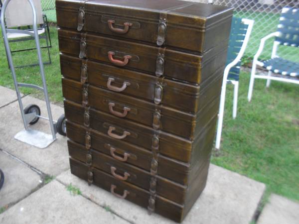 Vintage Faux Leather chest of drawers, stacked suitcase, 8 drawers, 30" x 14" x 42 1/2" tall, $150.00 (cash only)