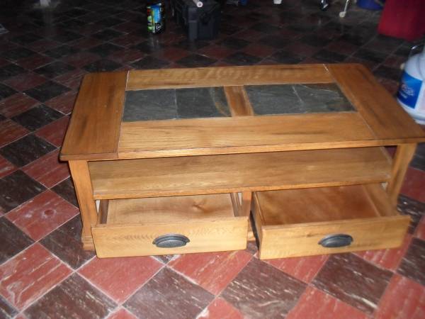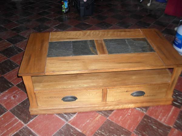 Sedona II Coffee Table, oak wood/rustic finish, slate top, 2 drawers and caster wheels, 24" x 48" x 17 1/2", $300.00 (cash only)
