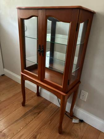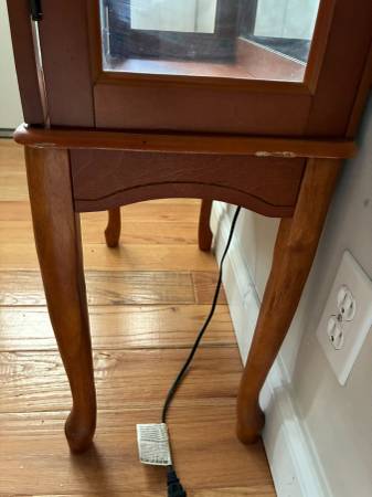 Curio Cabinet 42 7/8" T x 11 3/4" D x 23 3/4"W. 3 Tier Wooden Queen Anne Style. 3 Sides glass with mirror back. Back left side leg needs repair (it still stands with out repair). The light bulb flicks on then off fast, (not working). 2 Adjustable glass shelves 20 7/8"W x 9 3/4" D. Scuffs, worn finish and surface dep scratches. Chip on right side. I live close to south county mall in Oakville. I prefer text or call please, thanks.