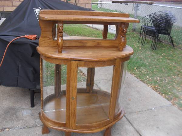Antique Curved Glass with shelf and mirror, lights up, with hand carved lions, solid oak, no shelf inside, 14" x 32" x 44", $250.00 (cash only).