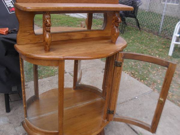 Antique Curved Glass with shelf and mirror, lights up, with hand carved lions, solid oak, no shelf inside, 14" x 32" x 44", $250.00 (cash only).
