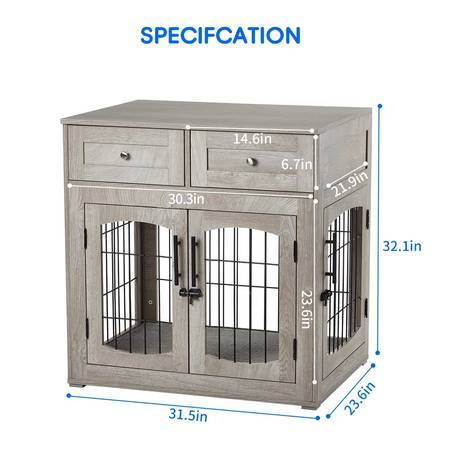 This dog crate can also be used as versatile piece of furniture such as a coffee table, display stand, or TV stand. There are three doors for your dog to go in and out easily. Made with durable MDF and steel, this piece of dog furniture is sturdier and more chew-resistant than only wooden dog crates and metal dog cage, offering a lasting, stable, and safe retreat for your fur friend. This dog kennel features three doors, including a double front door design and a left/right side door. The side door can be installed on either the left or right side to accommodate various spaces and convenience for your dog's entry and exit. No crate mat, however, my husband did install vinyl plank flooring in the crate for sturdiness. Hardly used. Smoke free home.