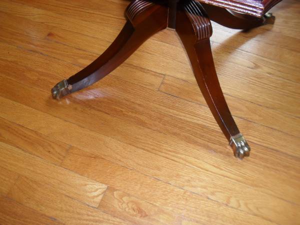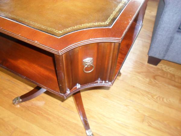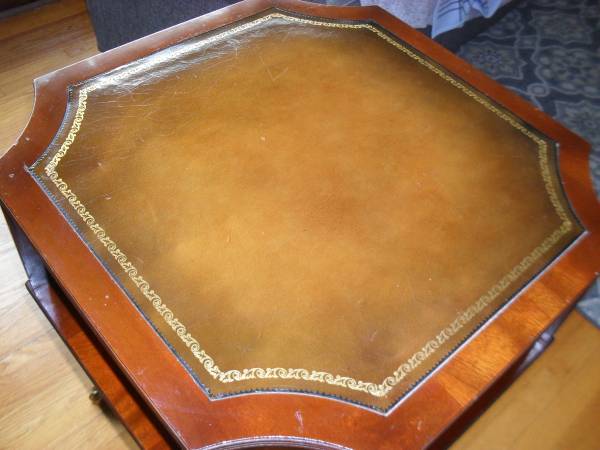 End Table/Accent Table, leather top with gold trim, hinges on each corner, open under the top, claw feet, 24" x 24" x 27", $200.00 (cash only)