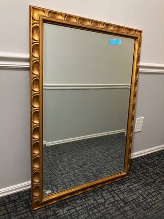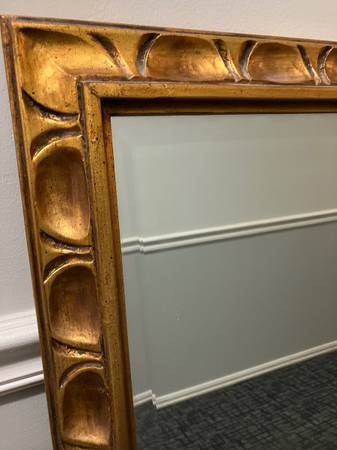 Heavy gold gilded wood framed mirror with beveled edge. 40”x 28” Solid hooks and backing for secure hanging. Smoke free home. Very nice quality. $100 firm. Exact change, cash, in person transaction....