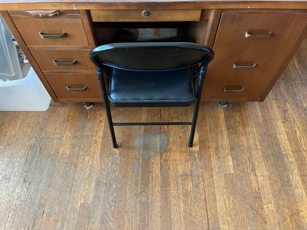 Leopold Mid-Century Executive Desk with Slide Out Note-Taking Shelf, Locking Center Drawer and Spring Loaded Typewriter Shelf inside Storage Door.