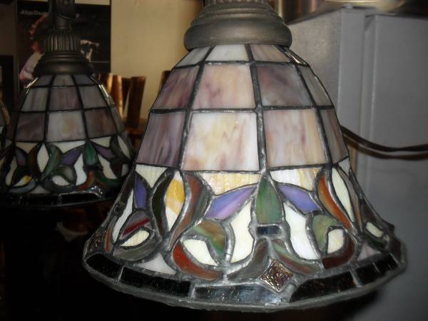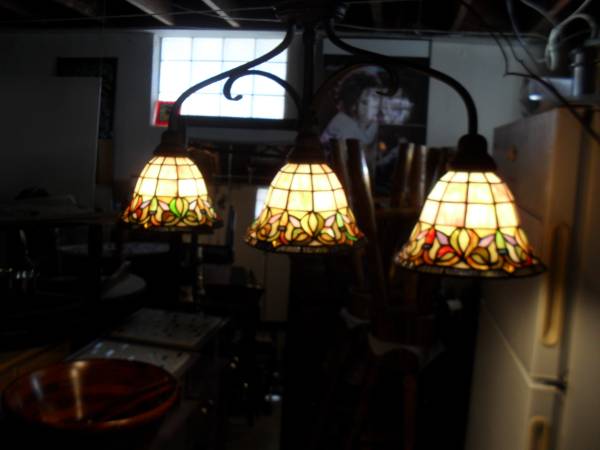3 Pendant stained glass hanging light fixture, metal, pool table light fixture, 33" wide, 32" tall, hook for hanging, each light is 9 1/2 round, works, $175.00 (cash only)