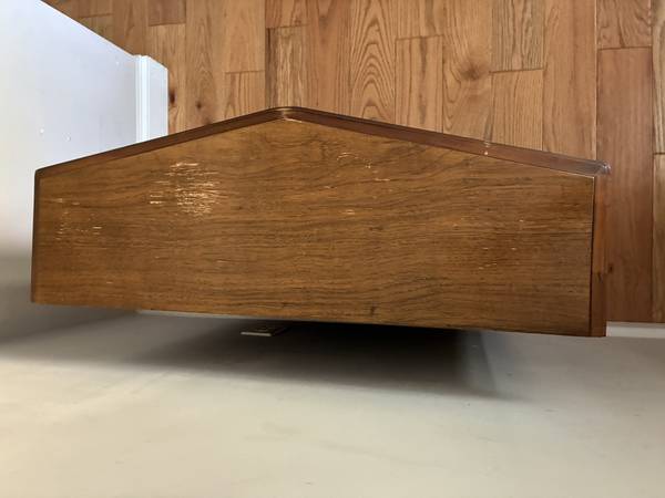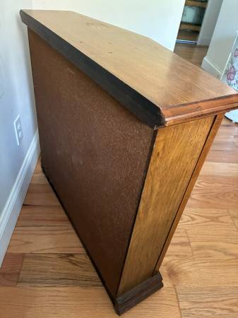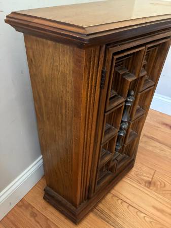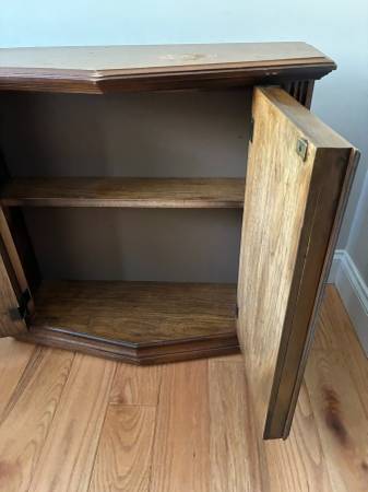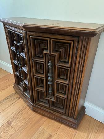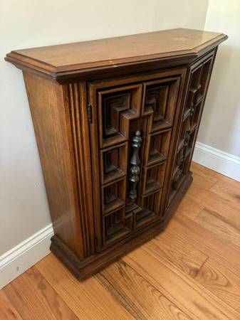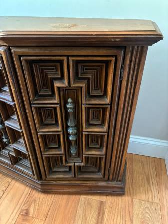 Mid Century Cabinet (Brutalist) Narrow Wooden French Doors. 29 7/8" Tall x 32 1/16" Wide x 11 1/2" Deep. 2 Metal handles and 2 shelves inside. Top center top is worn and finish is worn in area's. Magnetic closures on doors and inside frame. Doors are molded plastic. I live close to south county mall in Oakville. I prefer text or call please, thanks..