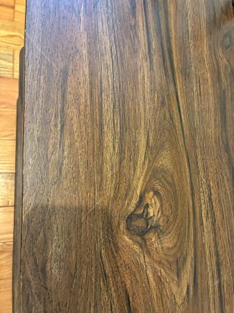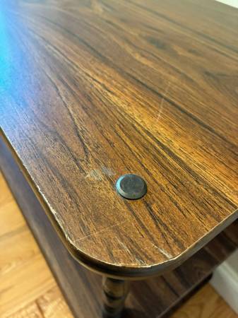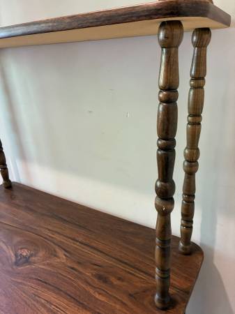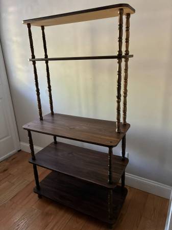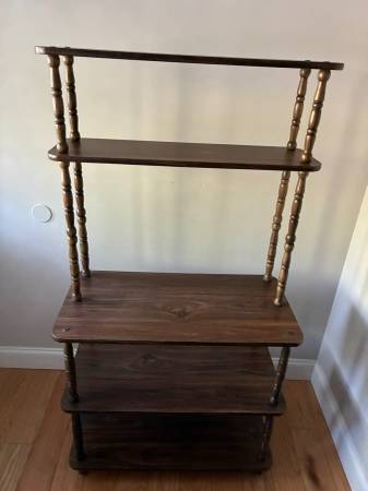 Mid Century Wooden (faux wood) 5 Shelf /Bookcase /Plant Stand 60 5/8" Tall x 32" Wide. Very top Shelves 9 5/8" deep. Three bottom shelves 15 7/8" deep. Second shelf from bottom up has fine scratches on right side edge. Few fine scratches in 3rd shelf and outer edge trim wrap. I live close to south county mall in Oakville. I prefer text or call please, thanks.