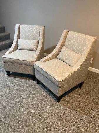 Nice pair of beige and white patterned club chairs with matching bolster cushion