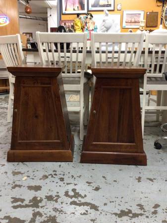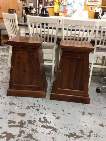 Pair Of Pine Trapezoid Pyramid End Tables By Pier One For Sale - 2 levels for shelf space - Pyramid style - Heavy Duty - Self closing doors Measures 📐 (Top half)16” w, 16” d, 31” h (Bottom half) 22”...