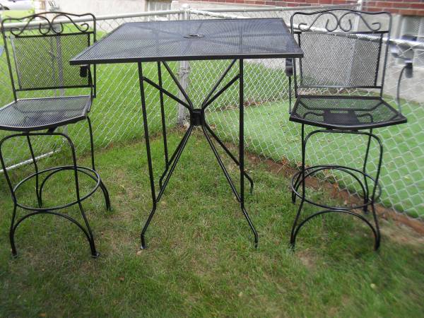 Wrought Iron Patio Set, Bar Height Table and 2 Bar Height Chairs, the table is 36" square, 40" tall, the chairs swivel, the seat is 17" x 20", from floor to seat is 29", overall height is 46",...
